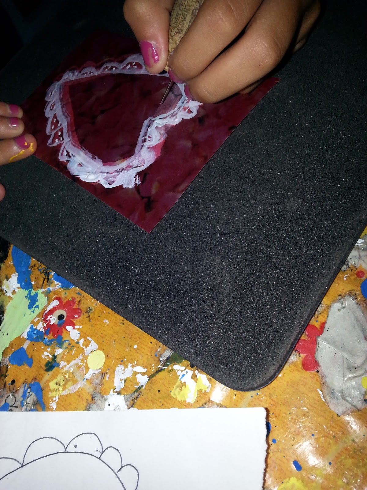 Tracing over a heart shape using white ink and a thin paintbrush...